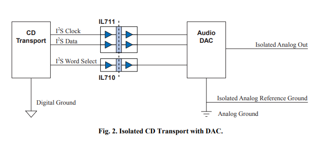 图2中的隔离系统说明了一种确保模拟和数字接地电流从不混合的方法,从而使扬声器输出更接近原始输出。在系统中增加三个隔离通道的成本很低。高质量的CD播放器已经有了单独的数字和模拟电源。数字隔离器确保没有数字开关电流